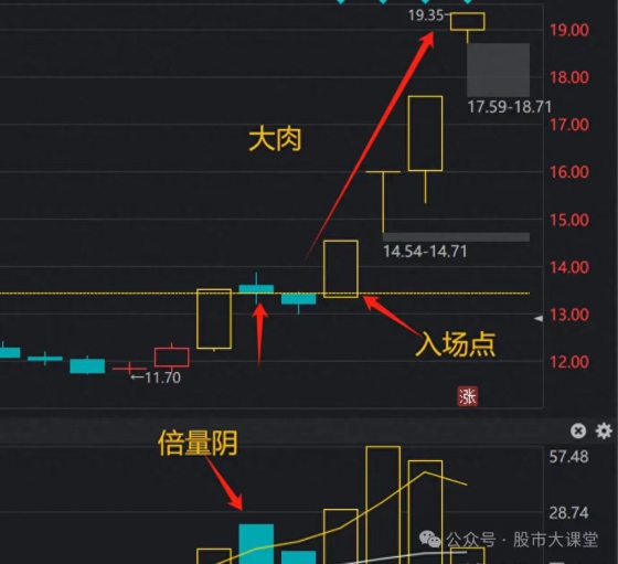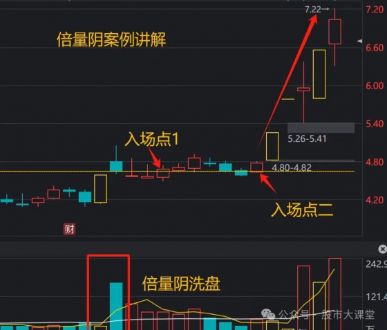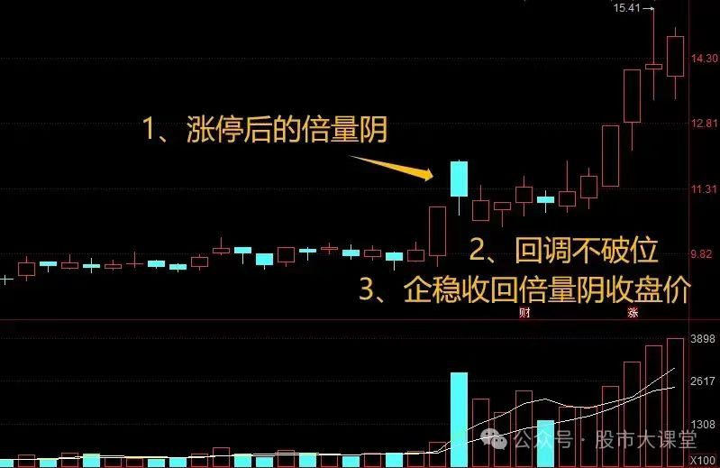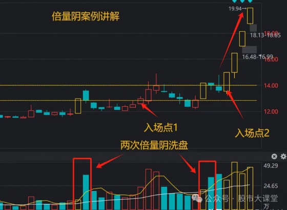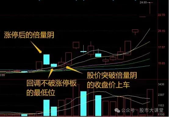 (1)突破倍量阴线收盘价进场;(2)回踩不破倍量阴线再次进场。
