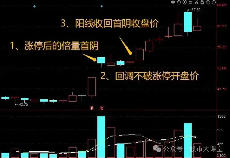 1、前一天的涨停是没有明显的放量的,第二天出现阴线并且明显放量,回调的时候没有跌破涨停的低点;