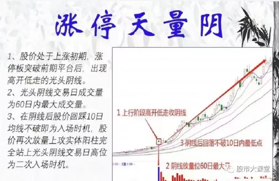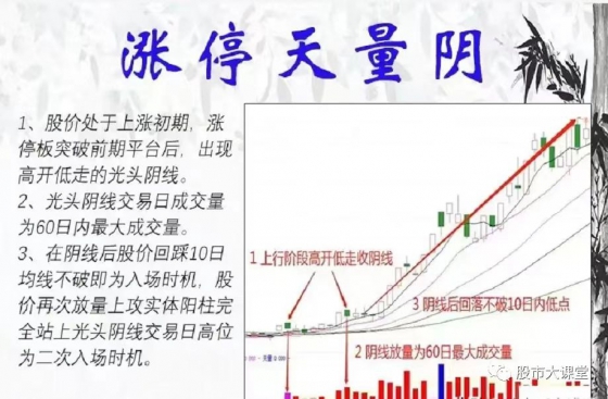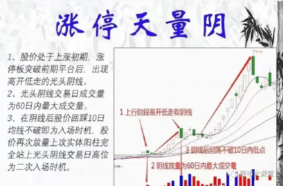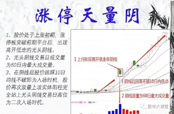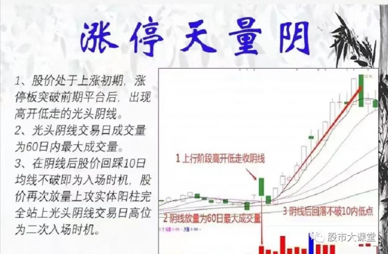 1、涨停板,可以是首板或者二板,次日出现阴线,并且成交量要放大两倍以上。